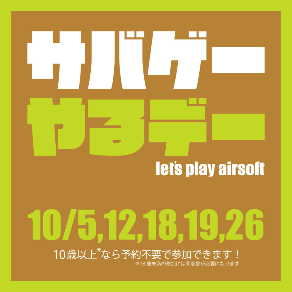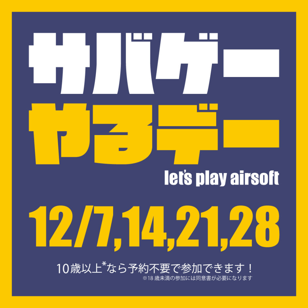毎週日曜日と土・祝日(不定期)は様々なプレイヤーさんが集まるサバゲーやるデーを開催しています。10歳以上であれば誰でも予約不要で参加出来て、途中参加・退場も自由に行えます。そして月イチ土曜日のみ開催している夜戦。夜戦は予約制で18歳以上のみ参加可能となり、蓄光弾とトレーサーが必要となります。